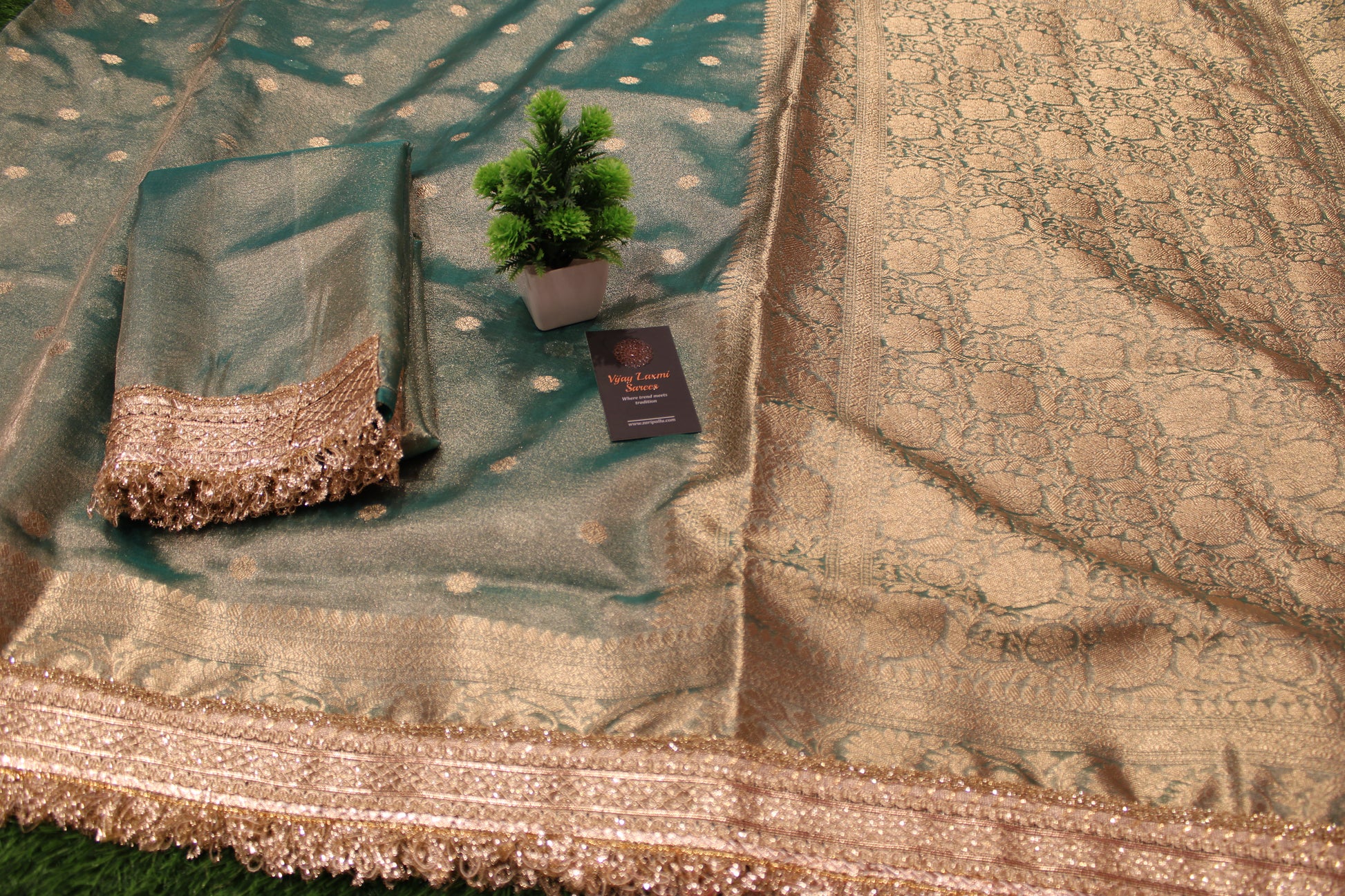 Experience sheer luxury with our Banarasi Katan Tissue Saree, a masterpiece that combines traditional artistry with contemporary charm. This designer saree is crafted to elevate your style, making it a perfect choice for weddings, festive occasions, and special gatherings.