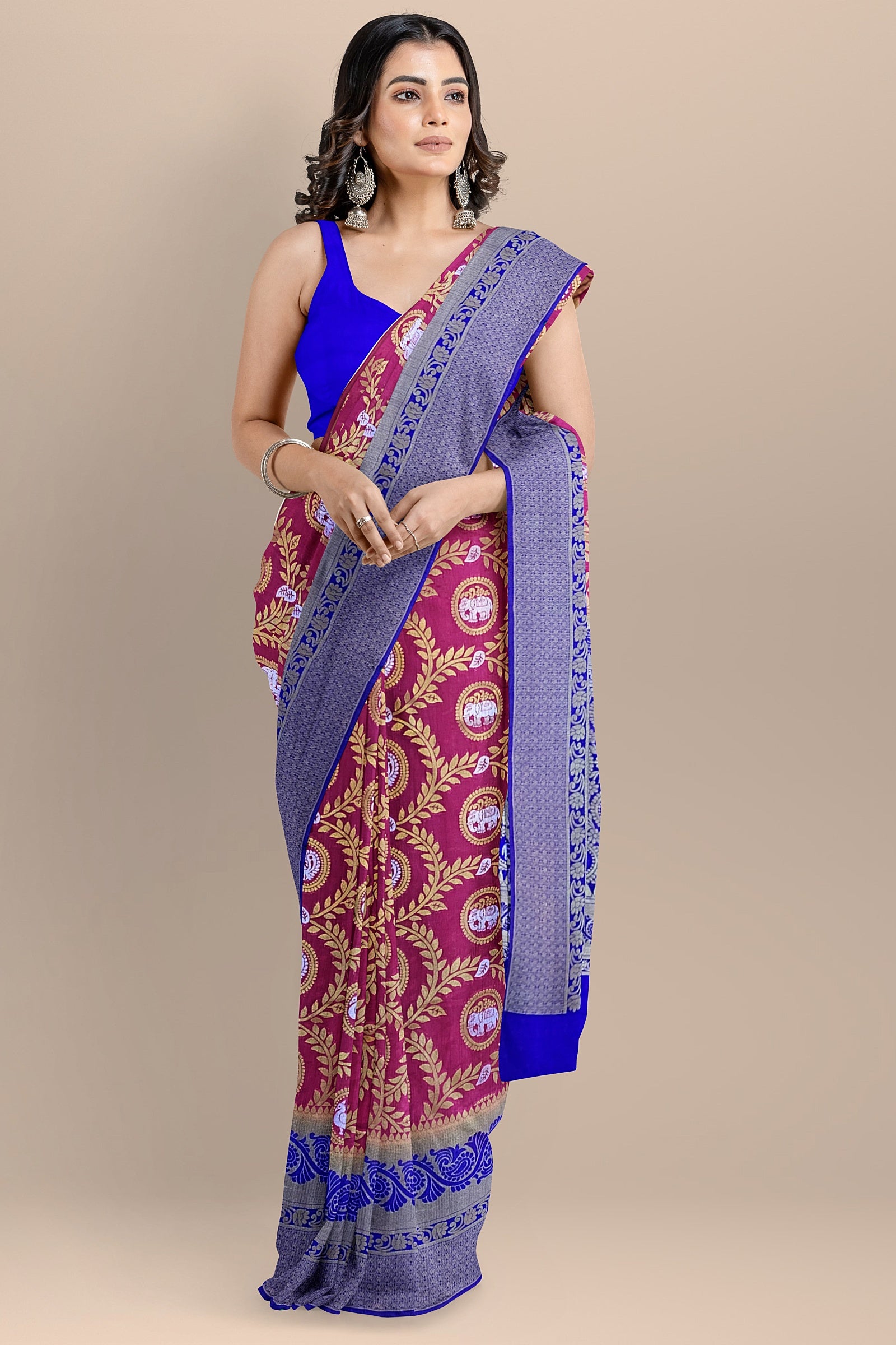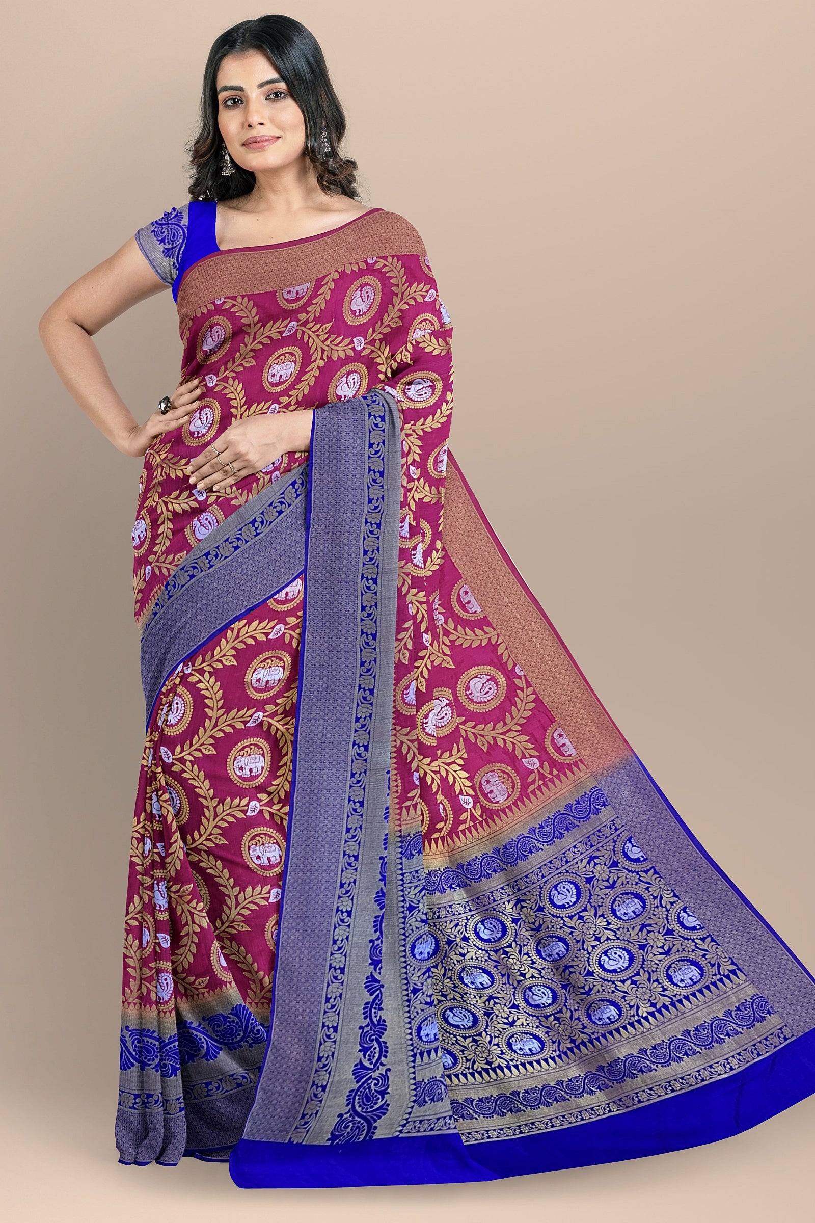 Step into a world of grandeur with this Pink and Royal Blue Saree, a stunning Paithani-inspired creation. Adorned with an all-over elephant design in luxurious Sona Roopa zari weave, this saree exudes timeless elegance and sophistication.