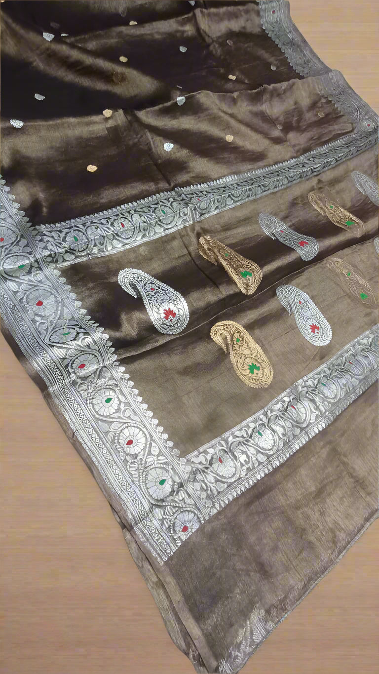 Expertly woven using the intricate Kadhwa (Lock Weave) technique, it features exquisite bootas all over in a luxurious combination of Golden, Silver, and Copper Zari. A delicate touch of Meenakari on the pallu and border enhances its grandeur, making it an ultimate premium piece.