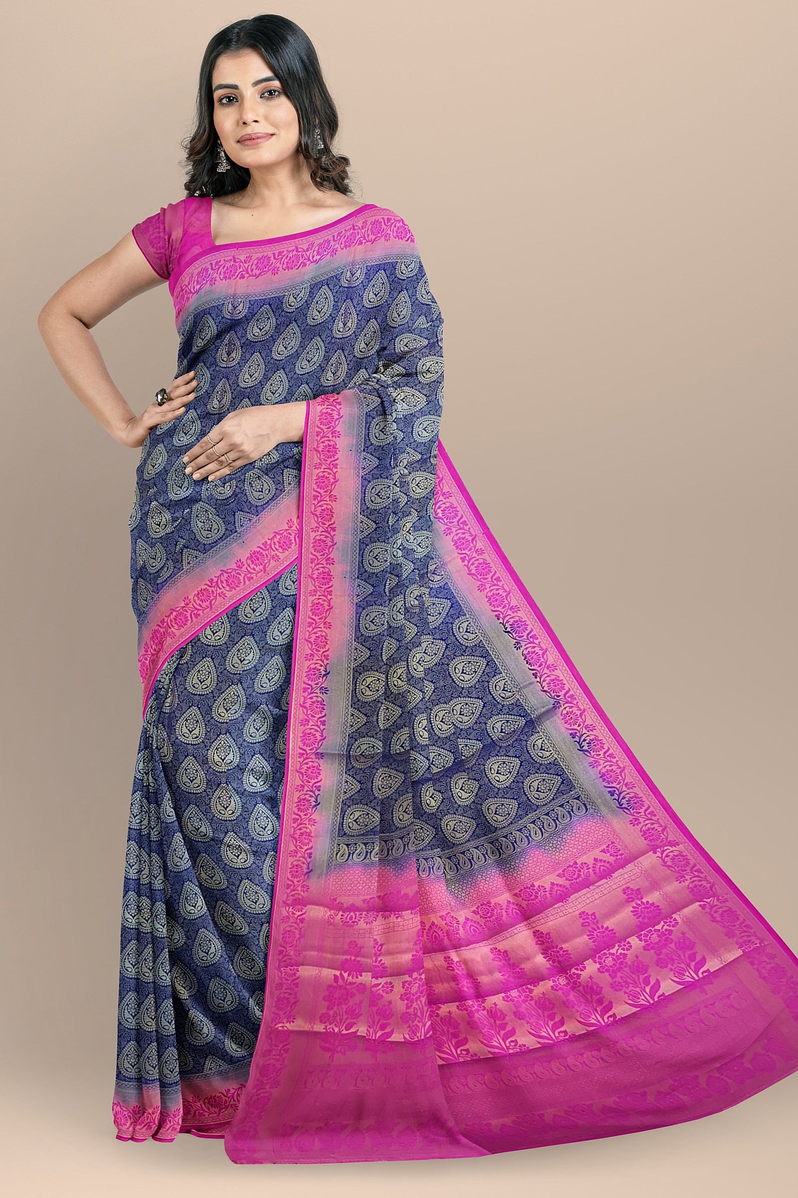 Colors: Royal Navy Blue body with vibrant Rani Pink contrast pallu & blouse
