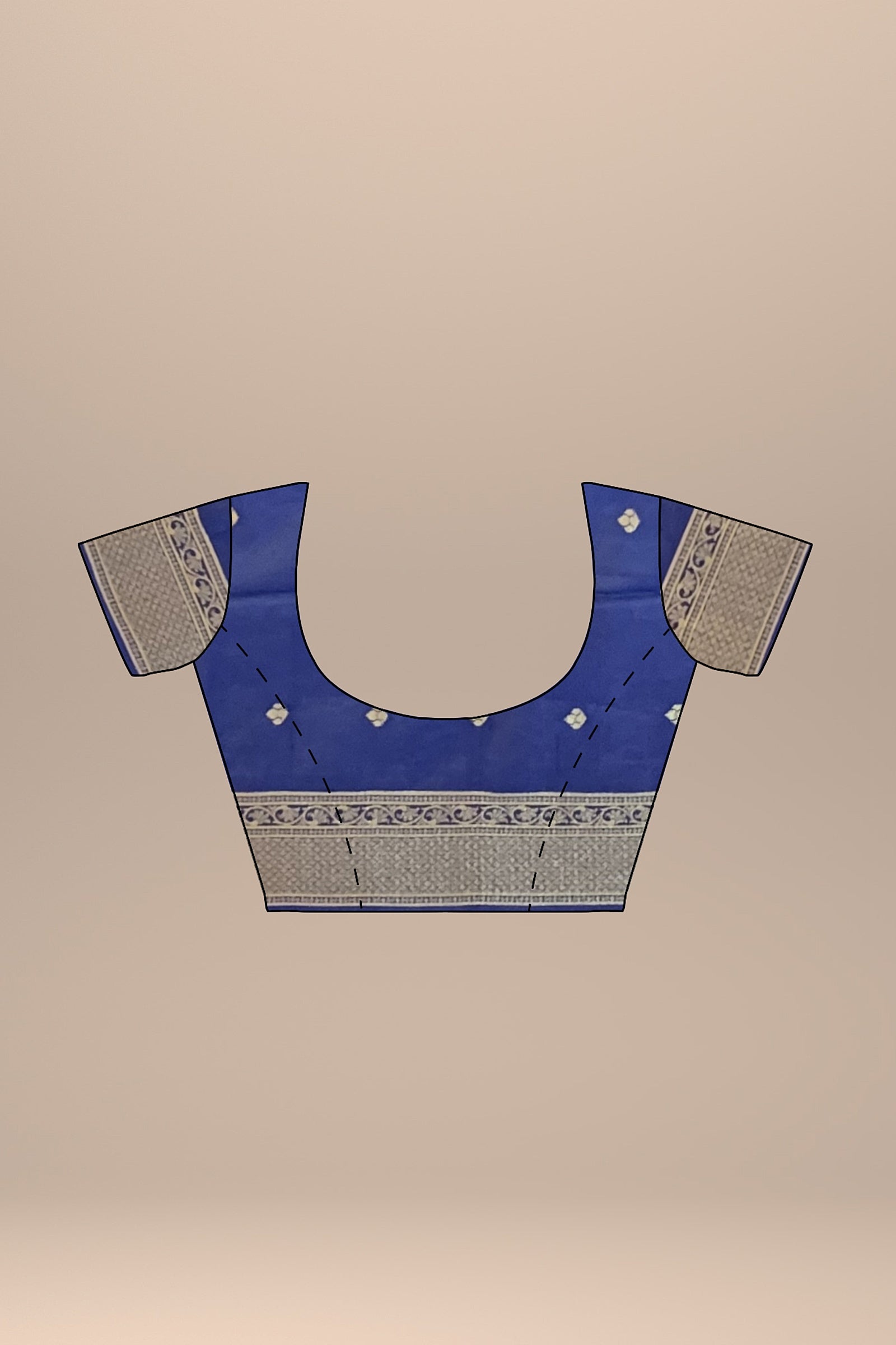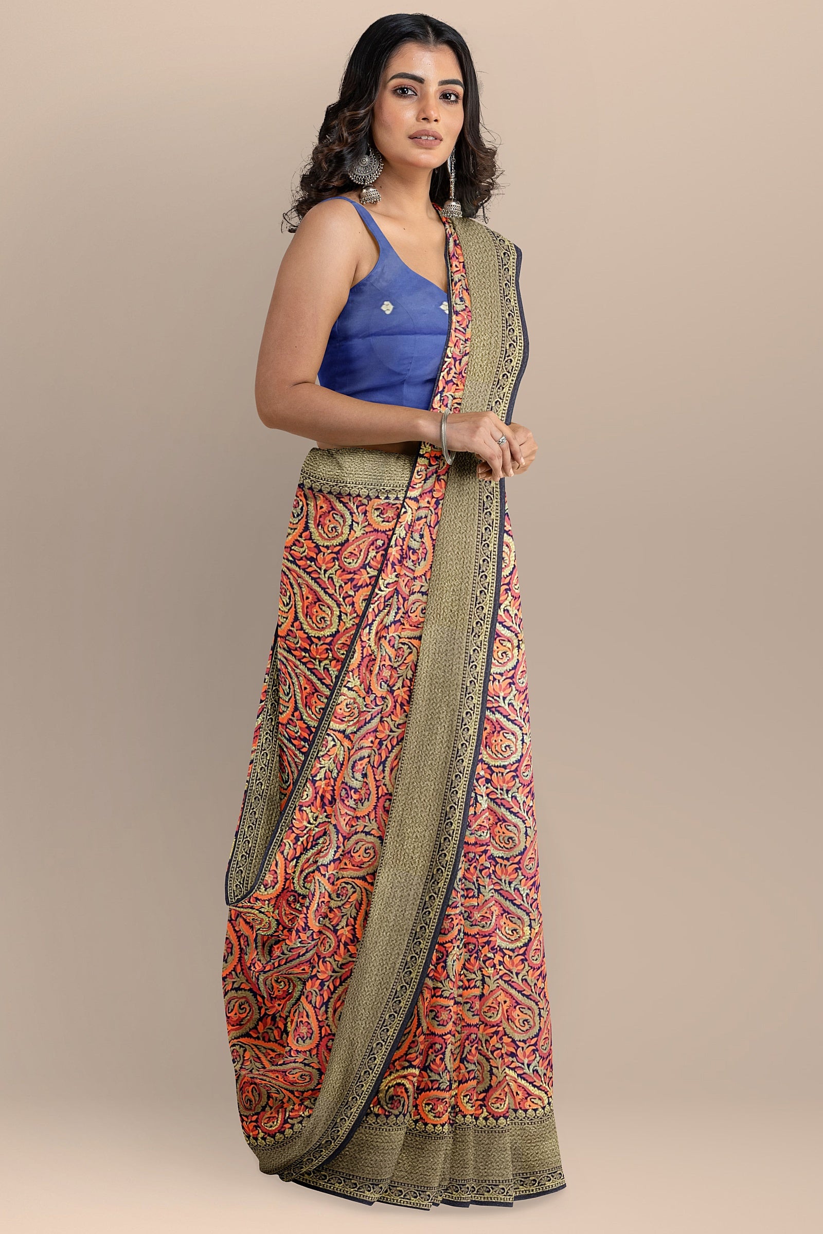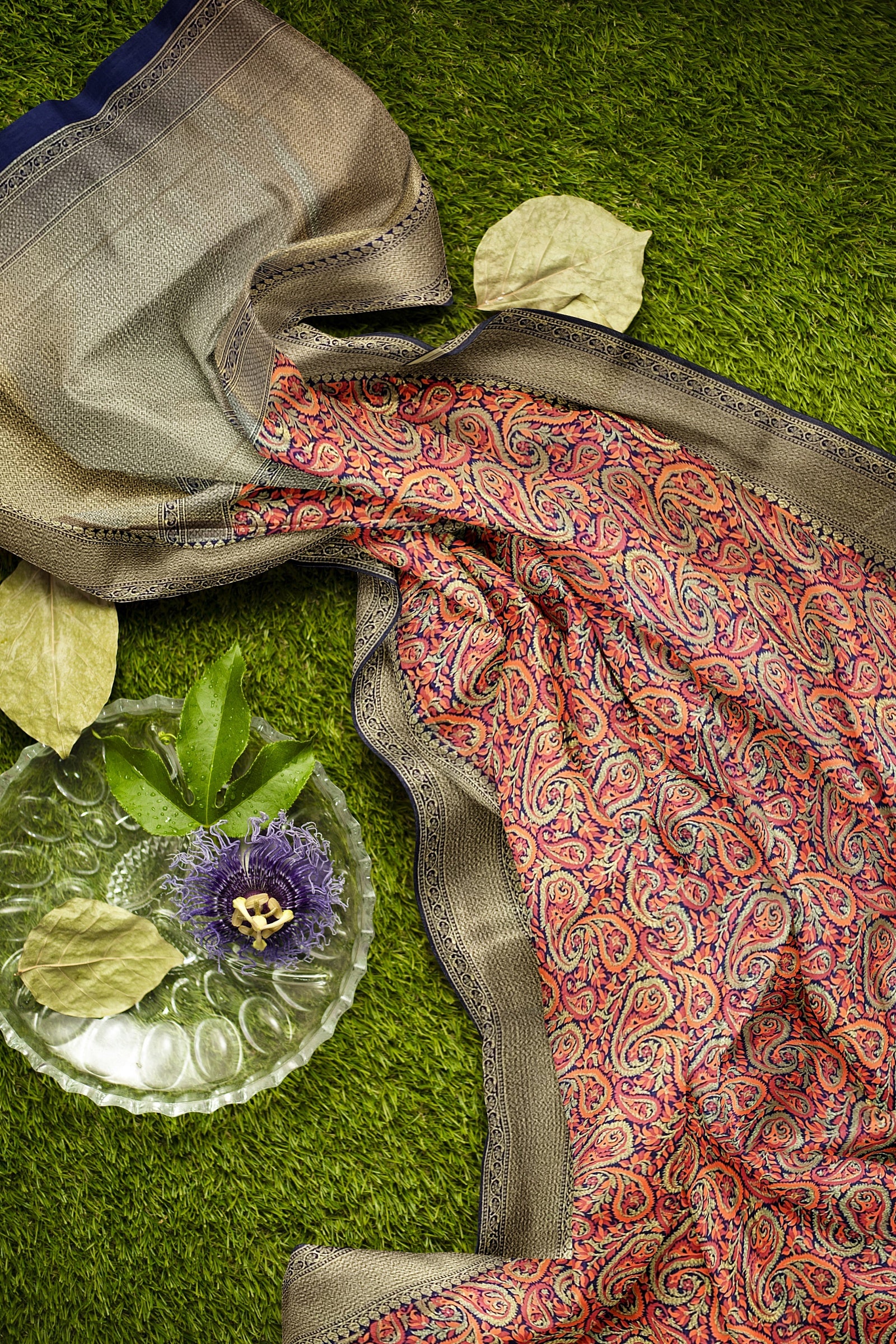 Experience luxury with this Pashmina Style Jamewar Saree, featuring antique zari weaving all over that adds richness and elegance to its royal design. The coffee-maroonish body paired with a deep navy blue blouse creates a sophisticated contrast, making it perfect for weddings, festive occasions, and grand celebrations.