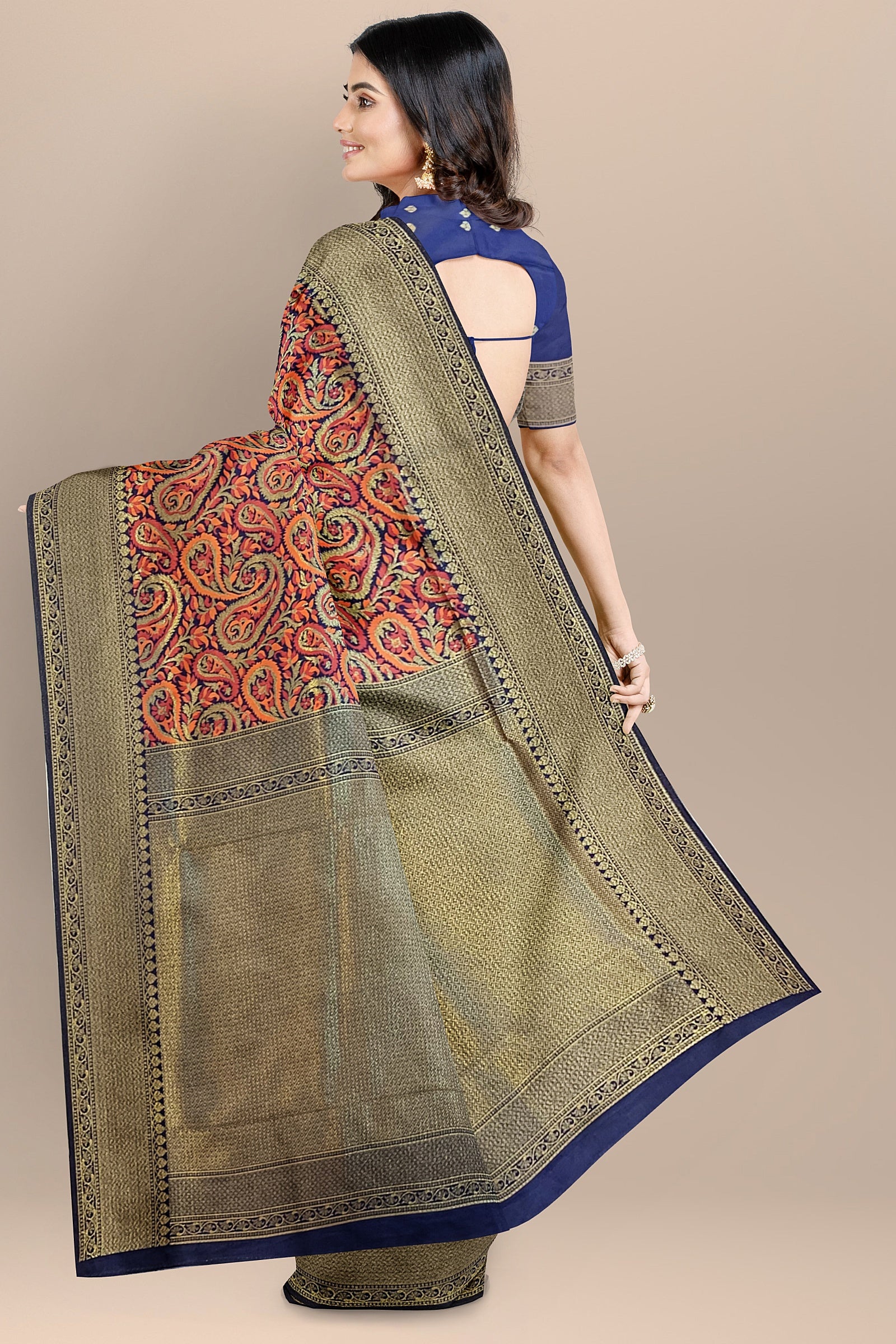 Pashmina Style Jamewar Saree with Antique Zari Weaving – Coffee Maroon with Navy Blue Blouse