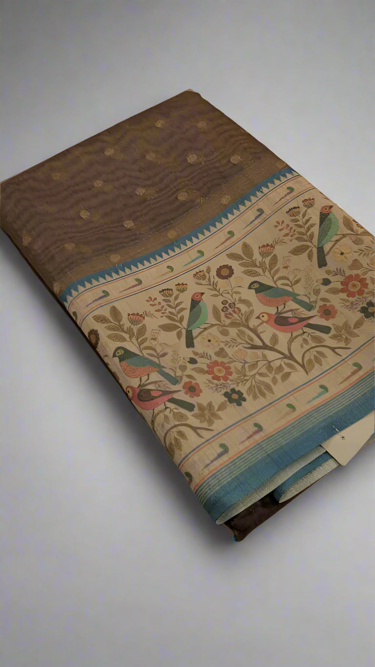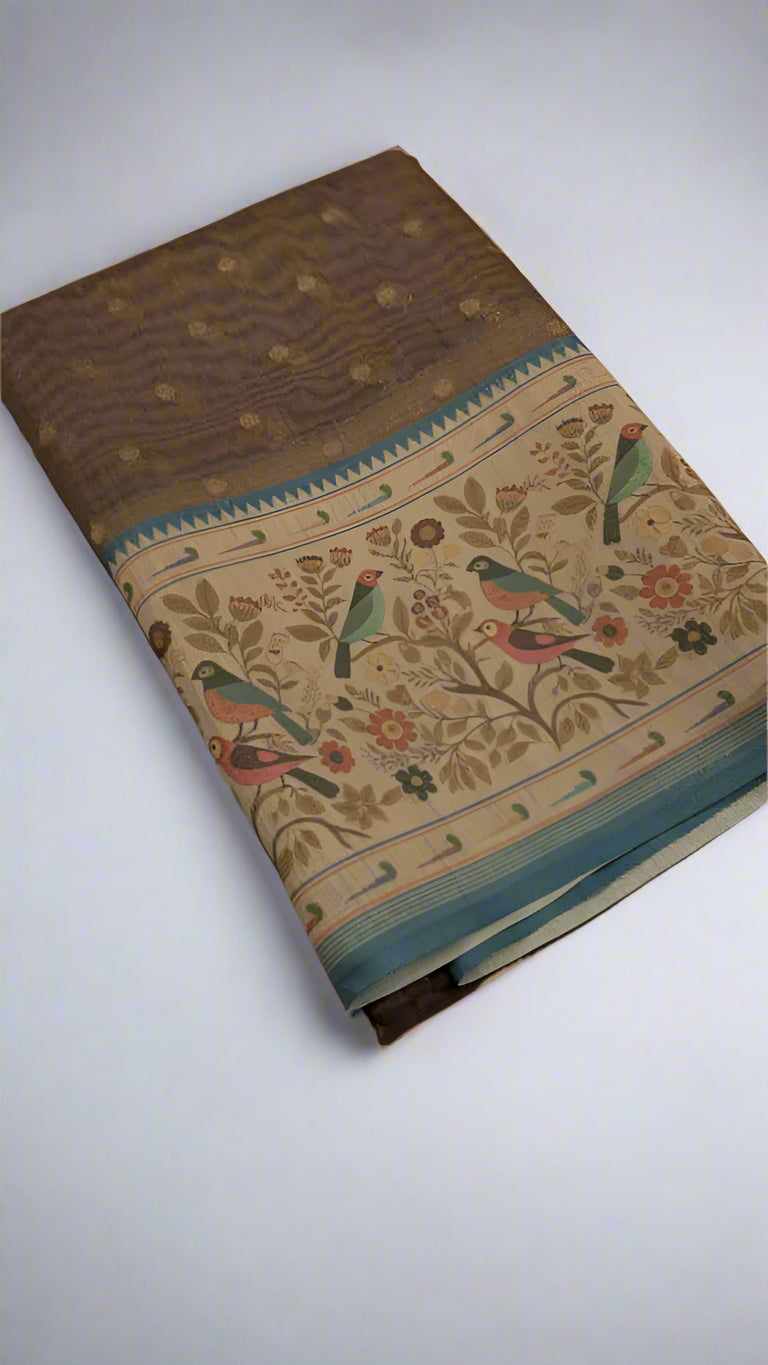 The highlight of this saree is the beautiful Paithani-inspired printed border and pallu, giving it a luxurious Maharashtrian touch while maintaining Banarasi heritage. Lightweight and breathable, it is perfect for festive gatherings, family functions, or casual elegance.